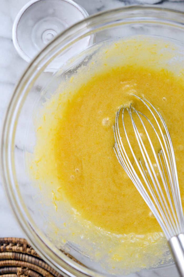 - In a mixing bowl add the lemon sugar, melted (and cooled) butter, eggs, lemon juice and vanilla extract. Whisk to combine.