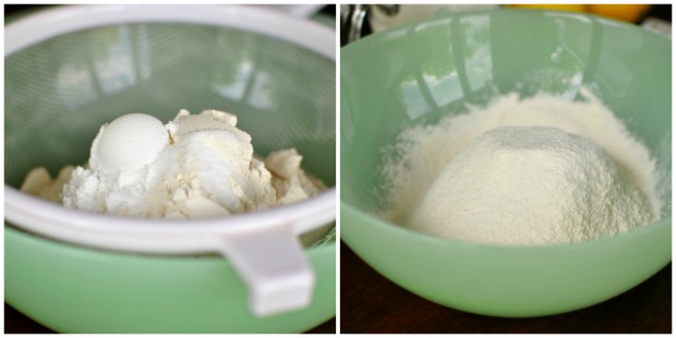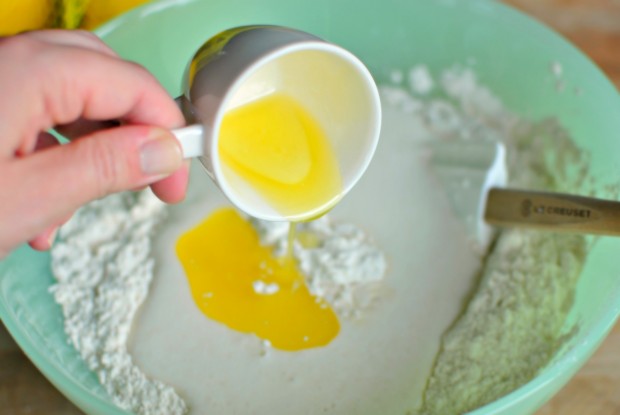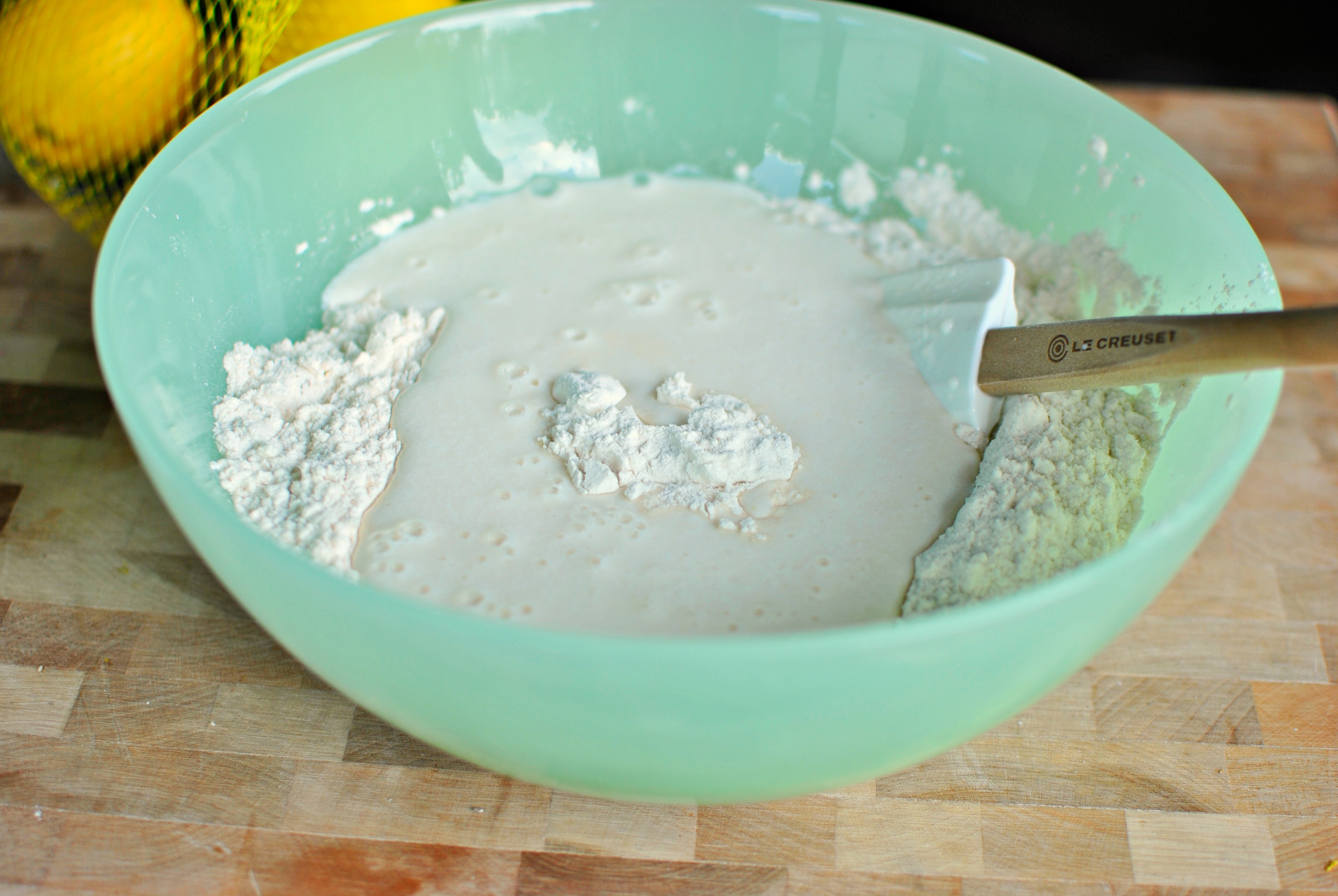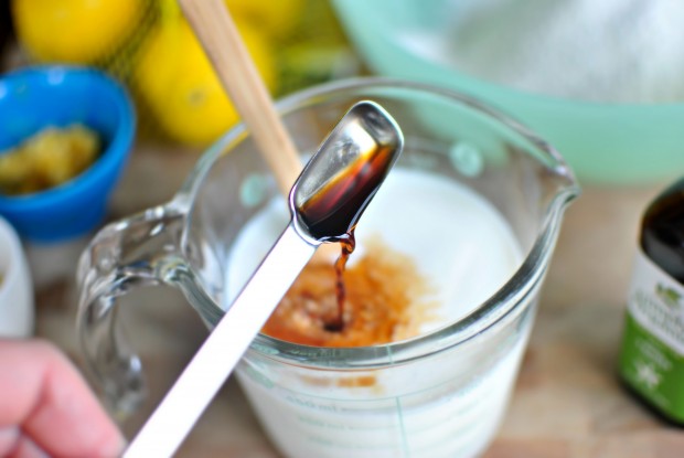 To the lemon sugar mixture add 2 large eggs, 3 tablespoons lemon juice, 1 teaspoon pure vanilla extract and 1-1/2 cups milk.