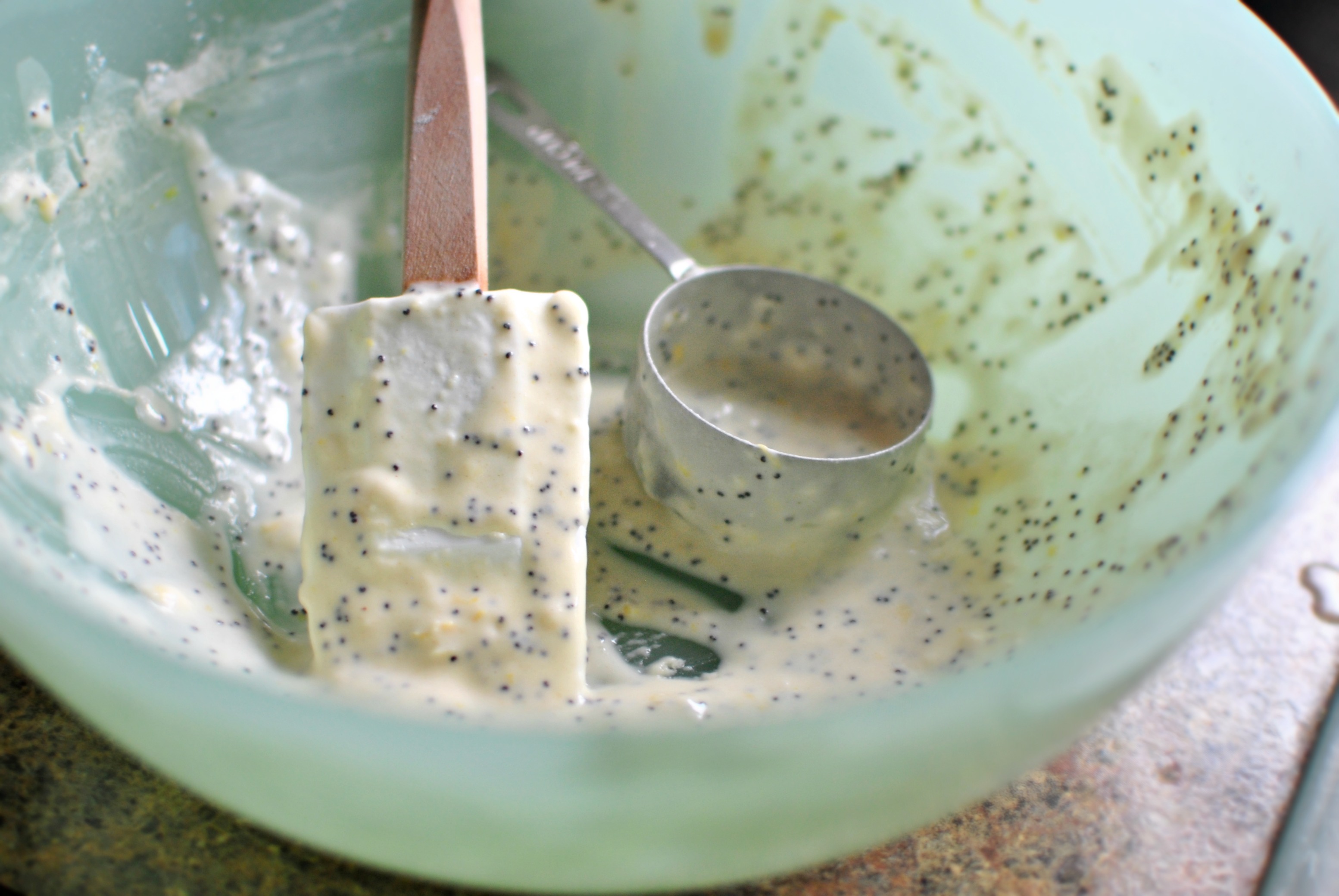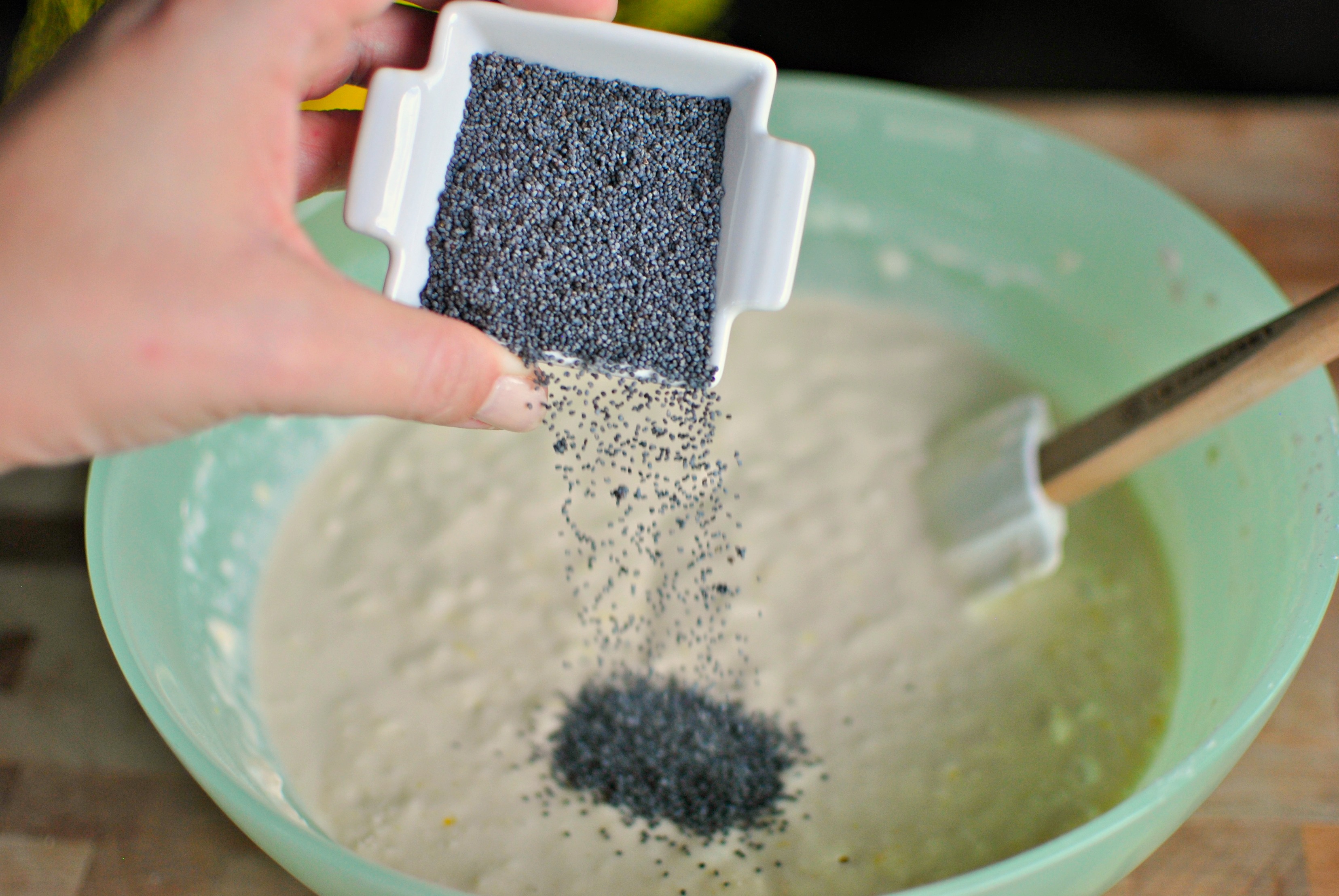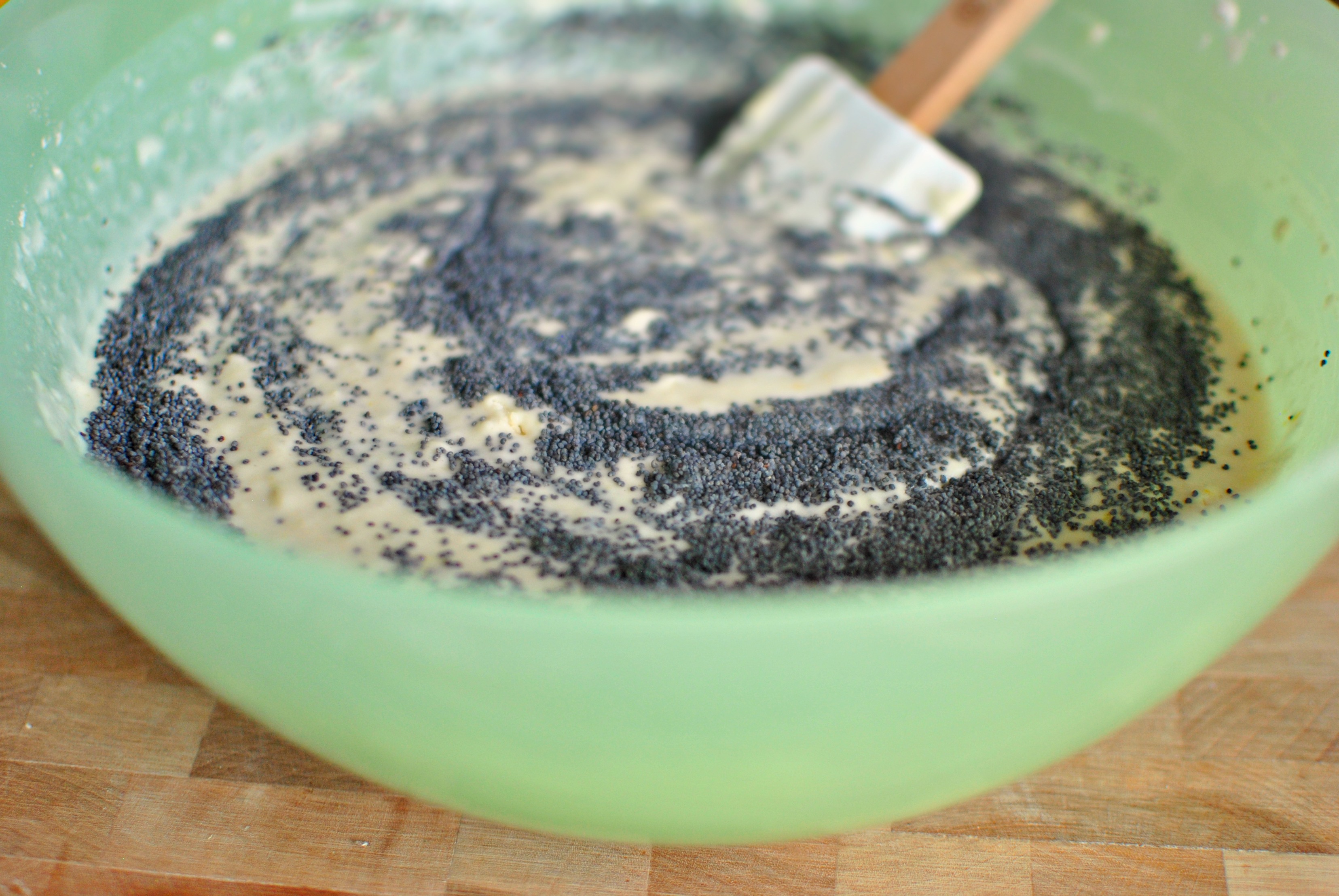 - Combine the flour, poppy seeds, baking powder and salt in a mixing bowl. Whisk to combine and set off to the side.
