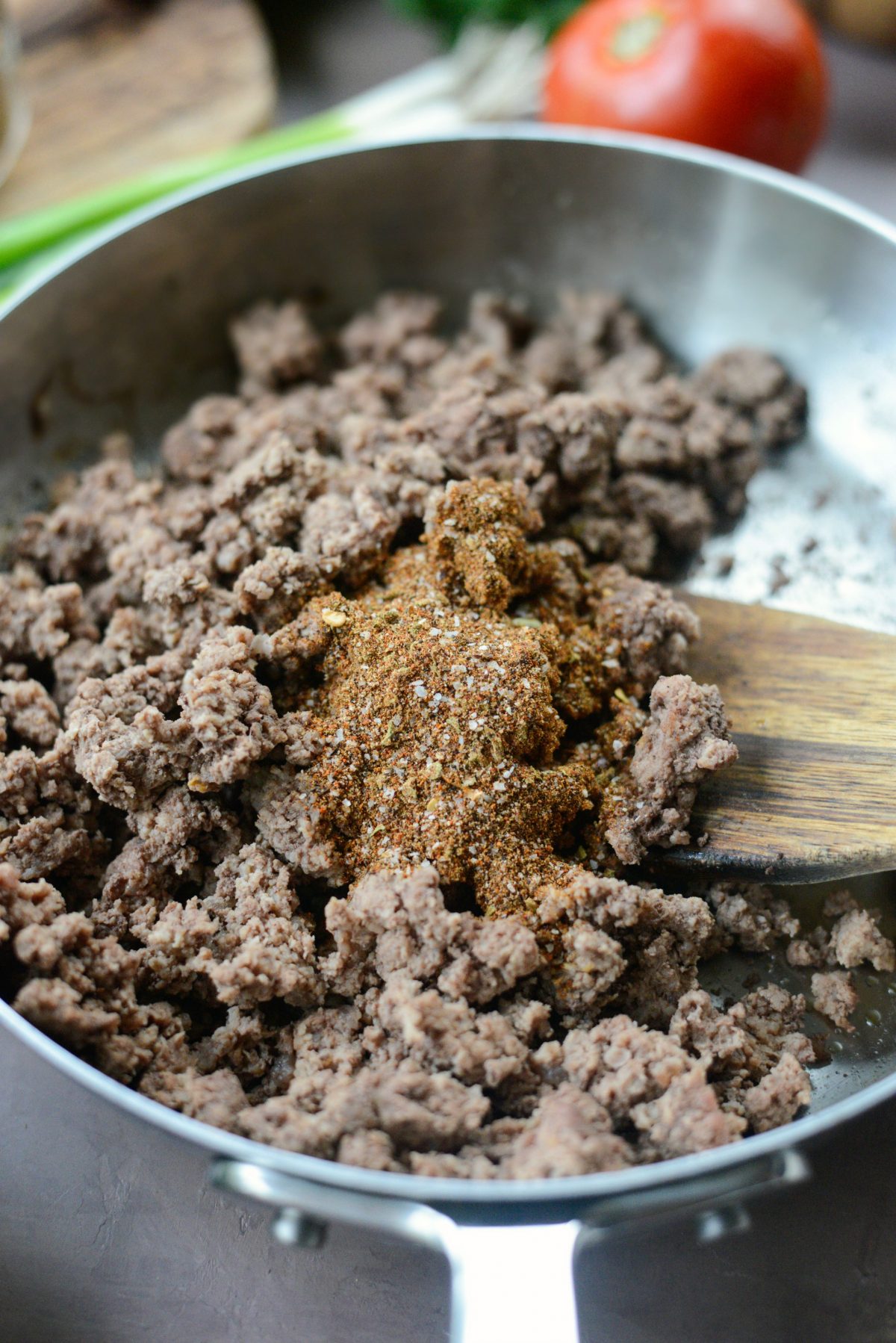 To start, use a spatula to break up a pound of lean ground beef. Next, cook over medium heat until browned and fully cooked. Then season the meat with 1-1/2 tablespoons of taco seasoning and set off to the side.