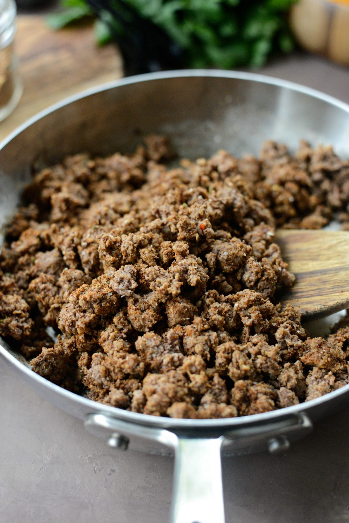 - In a medium skillet, cook the ground beef over medium heat until fully cooked and browned. Add in the taco seasoning and continue to cook or another minute or so.