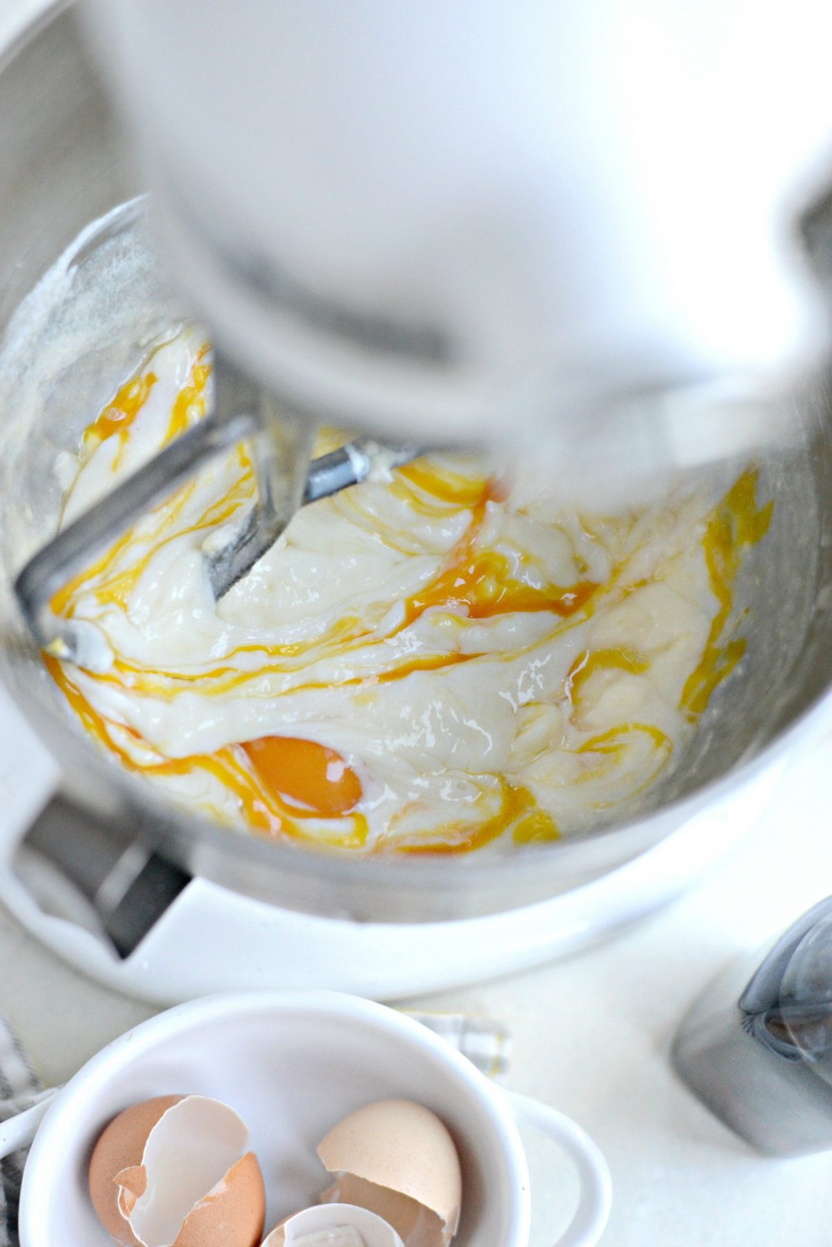 - In the bowl of your stand mixer, fitted with the paddle attachment, combine the butter, sugar and sour cream together until well combined. Next add in the eggs, one at a time and mixing after each one. Then add in the vanilla and mix until incorporated.