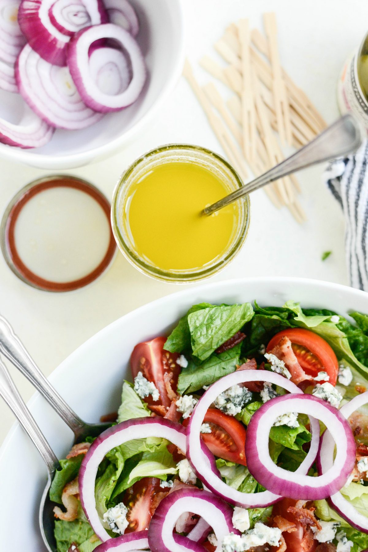 - In a large bowl toss the lettuces with a little of the dressing. The leaves should be lightly dressed and not soggy. Top with wedges of tomatoes, red onion slices and sprinkle with cooked, crumbled bacon and blue cheese. Grind fresh black pepper over top and serve with the extra dressing on the side.