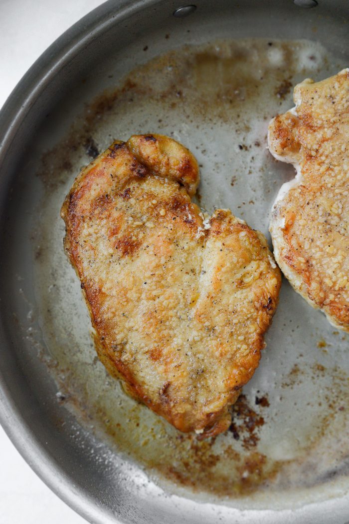 • Preheat a skillet on medium-high heat. If using stainless steel, test with water, it should quickly dance across the pan. When hot, add in 1 tablespoon olive oil and 1 tablespoon butter. Once melted, work in batches add 2 breasts and cook 4 to 5 minutes a side – for a total of 8 to 10 minutes or until a nice golden crust forms and the chicken is fully cooked.