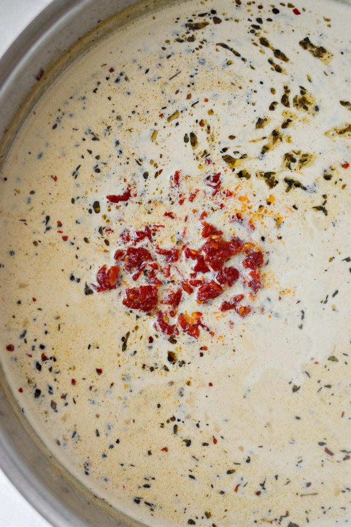 Once you’re ready to serve, spoon the sun-dried tomato cream sauce over top.