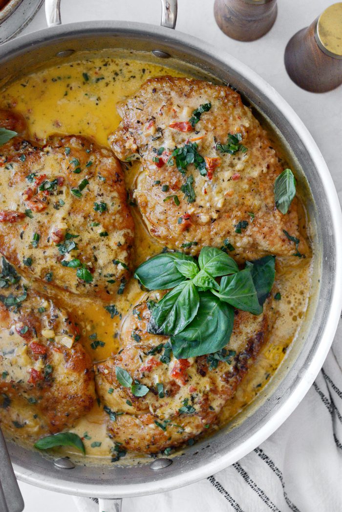 • Add the cooked chicken breasts back into the cream sauce and heat through. Once you’re ready to serve, spoon the cream sauce over top and sprinkle with chopped fresh basil and extra parmesan (if desired).