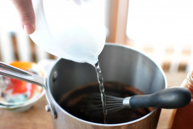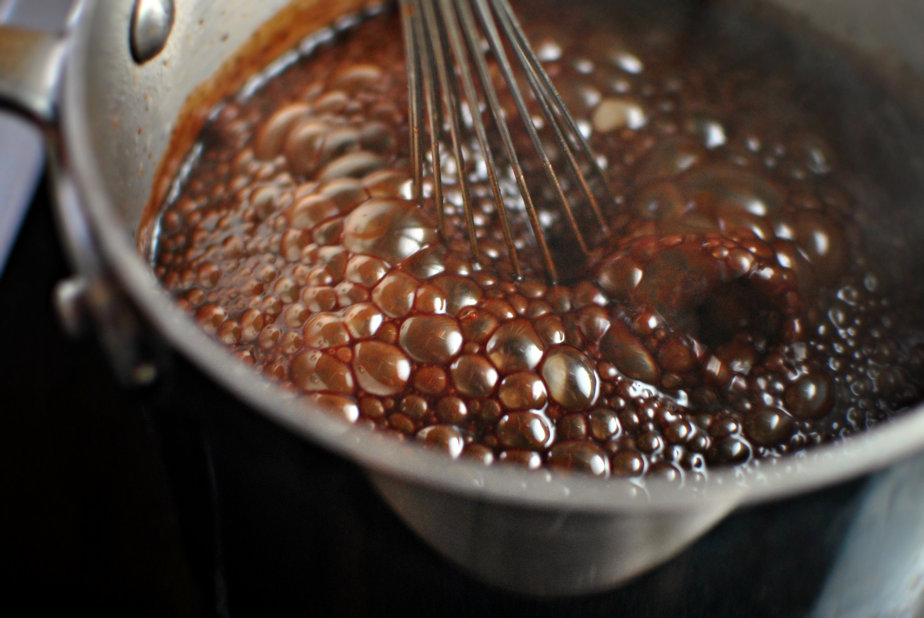 - In a medium saucepan add the sugar, unsweetened cocoa powder, spices, salt and water. Bring to a boil, whisking until the sugar has dissolved.