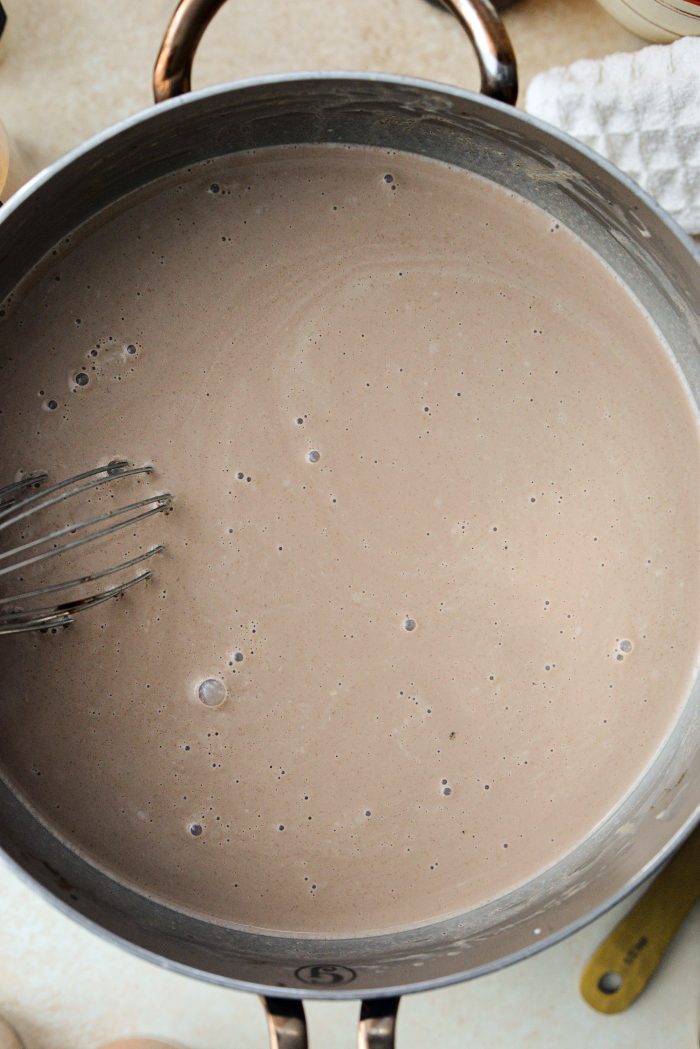 Remove off of the heat and pour in the 2 cups of whole milk and 2 cups of heavy cream.