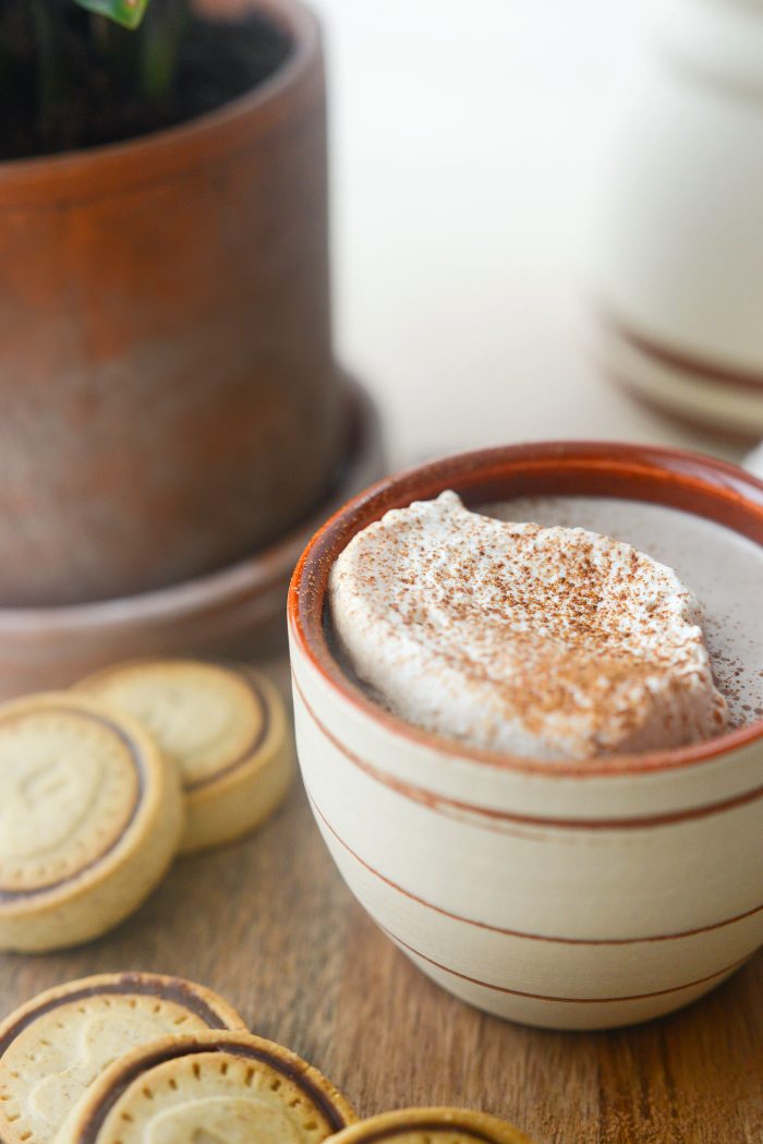 This cup-of-cozy is creamy, chocolaty and is delightfully spiced with cinnamon, ginger, allspice and a pinch of cayenne – which gives you some subtle heat at back of the throat. And instead of the traditional marshmallow toppers, I whipped up a homemade cinnamon whipped cream. To. Die. For.