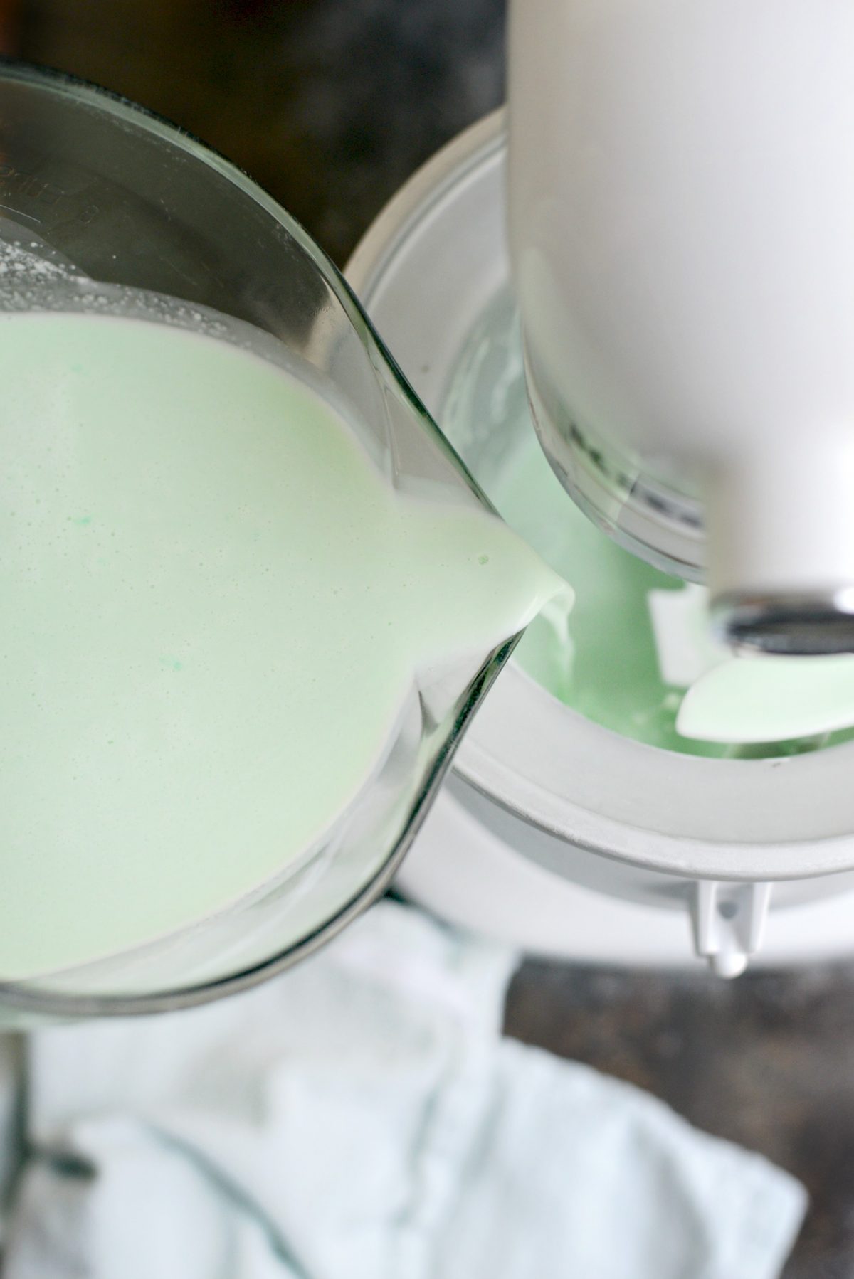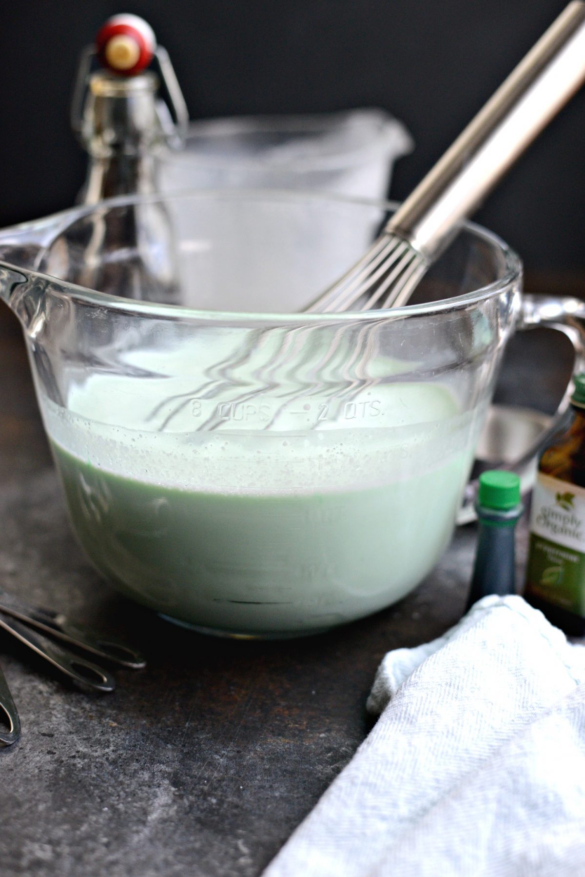 - Next add in the vanilla, mint extract and 6 drops of the green food coloring, whisk to combine.