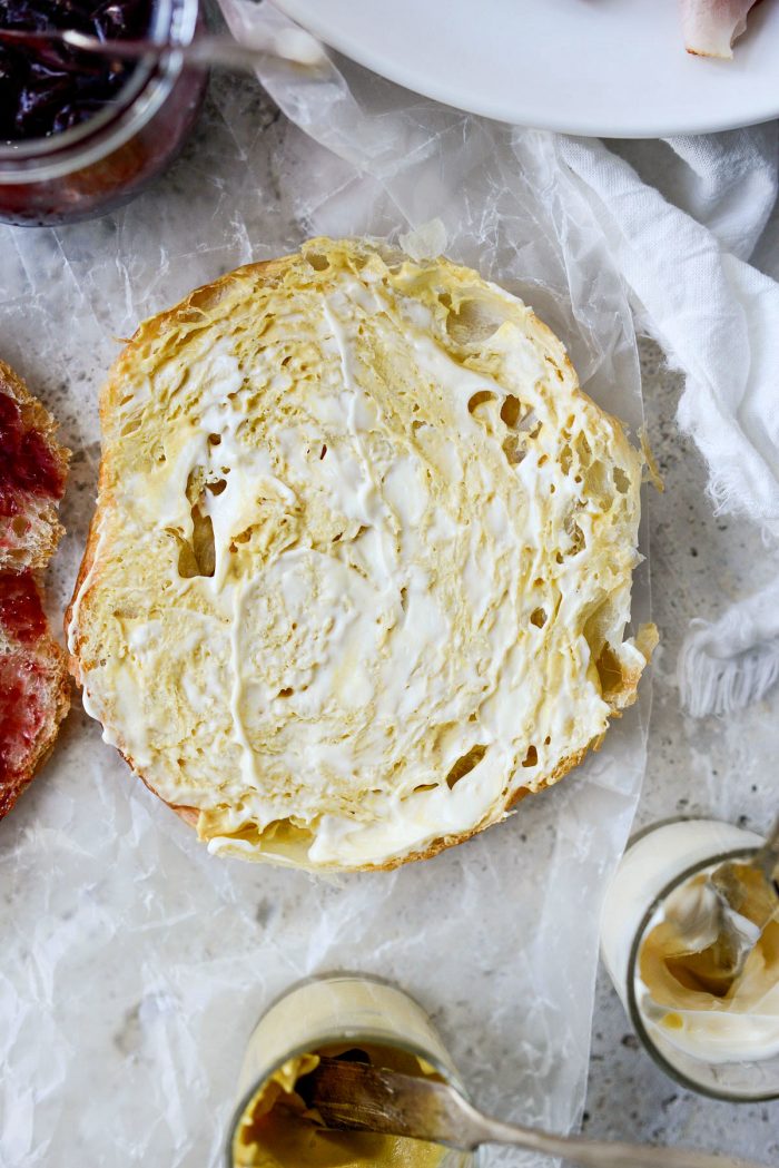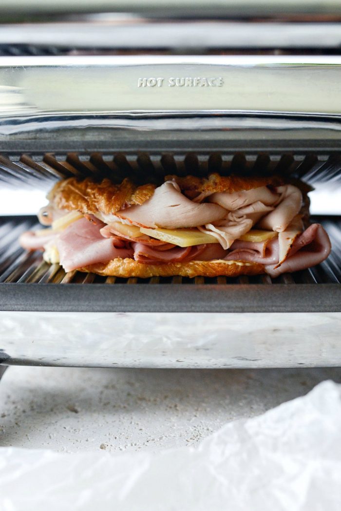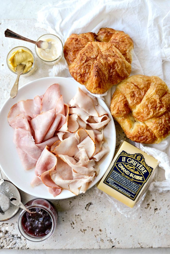 Flaky croissants are spread with seedless raspberry jam on one side and mayo and dijon (or yellow) mustard on the other. In between are layers of ham, turkey and gruyere cheese. All of this gets pressed in a hot panini press until crispy golden and perfect. There’s just no way this could not be amazing, right?