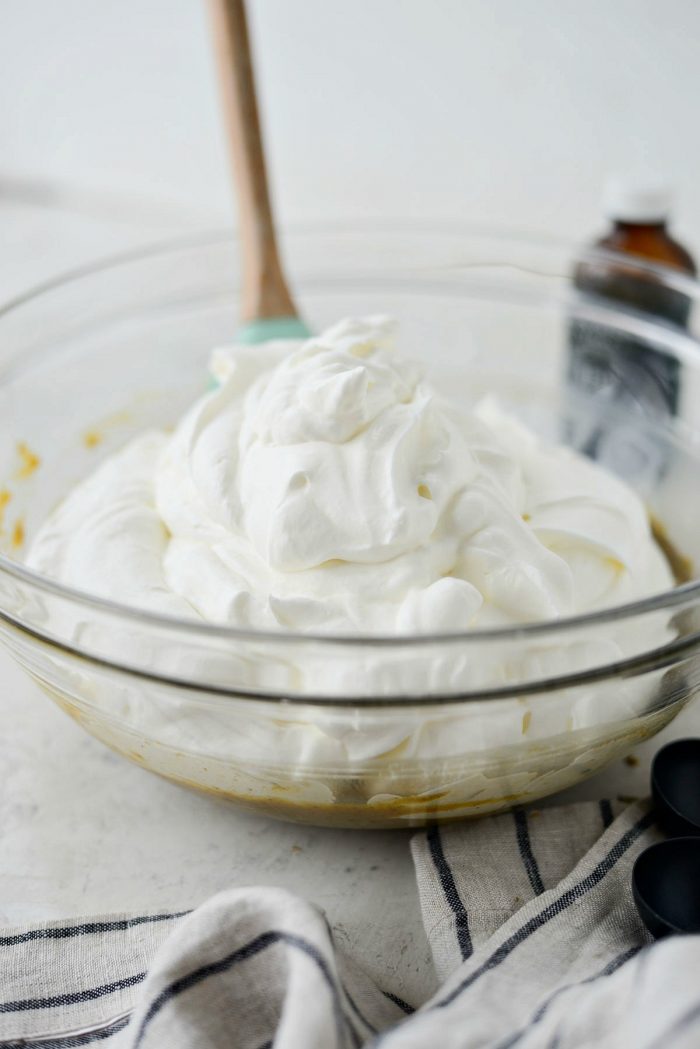 - Pour the heavy whipping cream into a separate mixing bowl (see notes). Using a hand held mixer, mix on high-speed until stiff peaks form.
