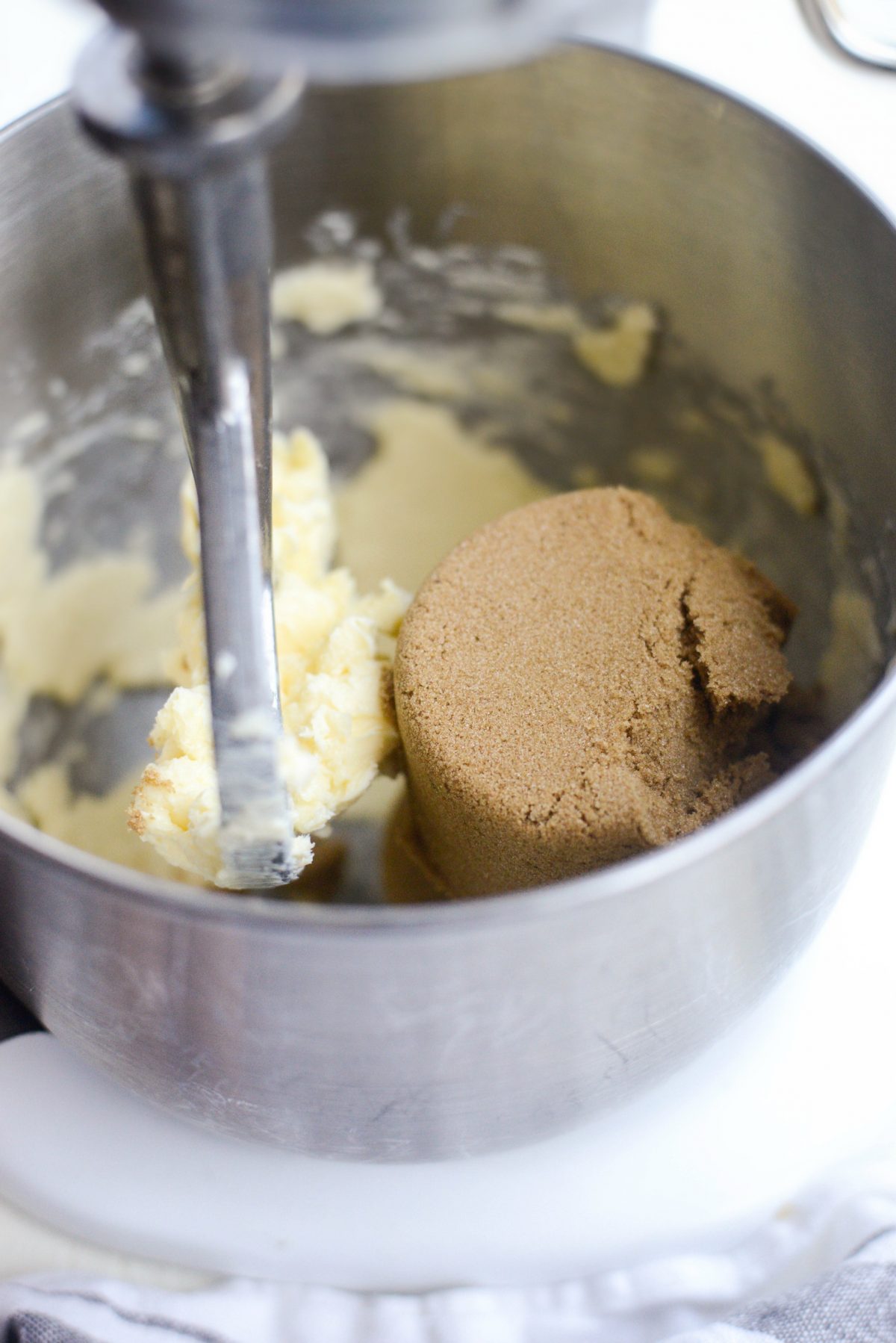 - In the bowl of your stand mixer - fitted with your paddle attachment, add in the softened butter and mix until creamy. Next, add in the dark brown sugar and mix until light and creamy, about 2 minutes.