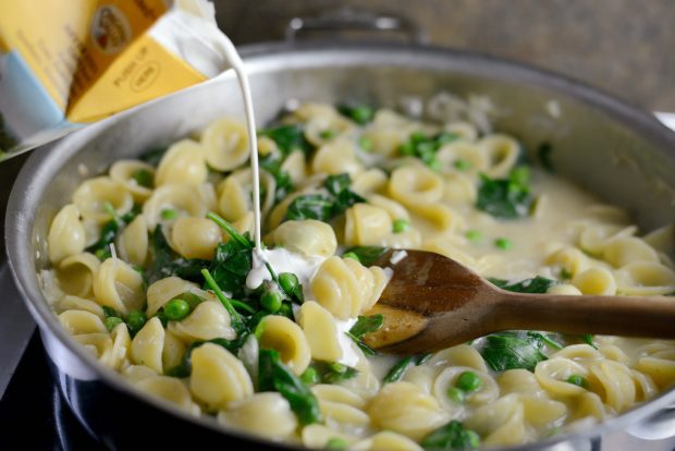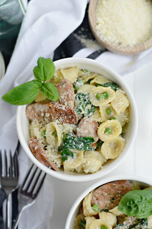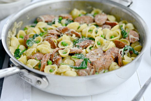 Imagine cooking your entire pasta dish in one pan. I’m talking chicken sausages, spinach and peas swimming with cute little orecchiette pasta in a creamy sauce. Again, all of this is done in one pan.