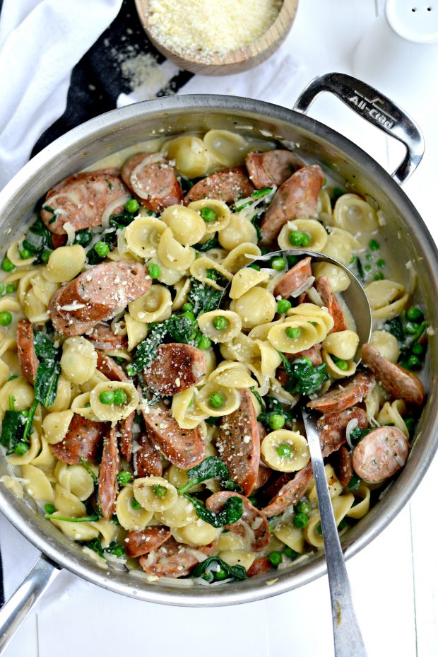 - Reduce heat to low, add in the spinach, peas and Parmesan. Stir until the the spinach has wilted. Add in a few splashes of heavy cream before adding the sausages back in and seasoning to taste with salt and pepper.