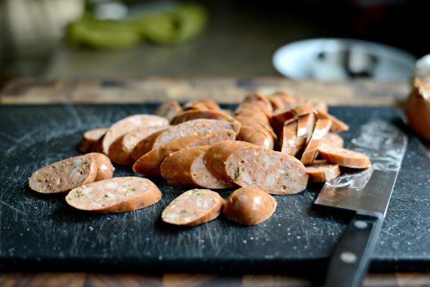 First, slice the chicken sausages about 1/4 of an inch thick and on an angle.