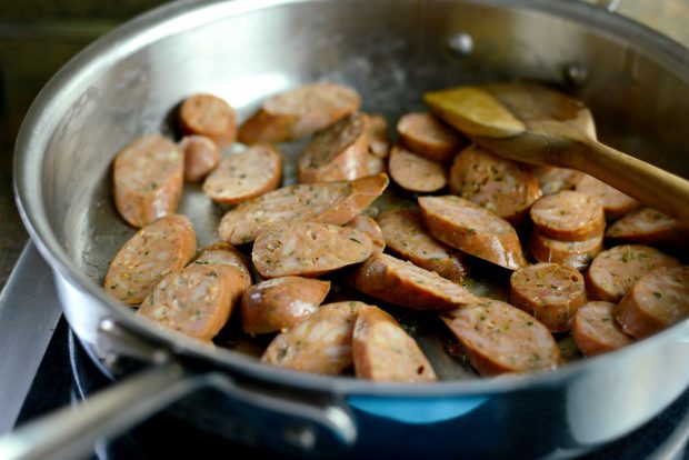 Meanwhile, heat a deep 10-inch skillet over medium heat with a tablespoon of olive oil and once hot, add in the sausage slices. It shouldn’t take too long to crisp and golden those edges.