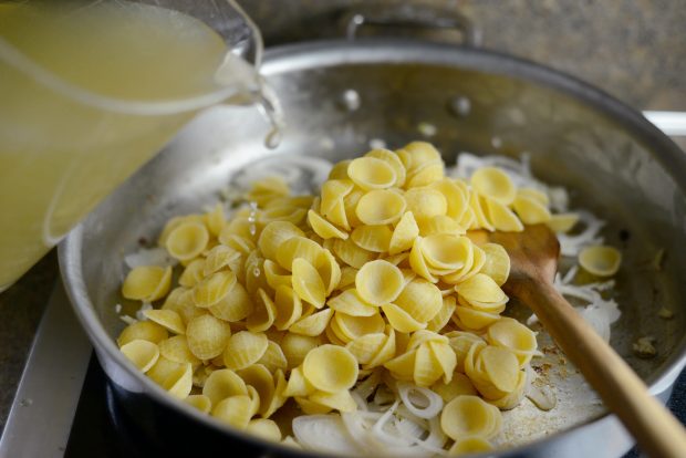 Next, add in 2 heaping cups of orecchiette pasta and pour in 4 cups (1 quart) low sodium chicken broth.