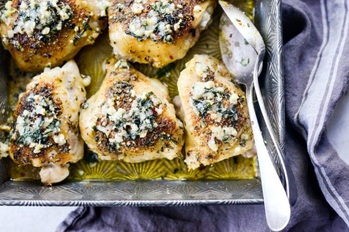 I’ve said it once, and I’ll say it again: I love baked chicken. Crispy flavorful skin, tender meat…usually served with mashed potatoes. You feel me? This recipe was inspired by a childhood favorite, my mom’s baked chicken, but with a herby, parmesan garlic twist.