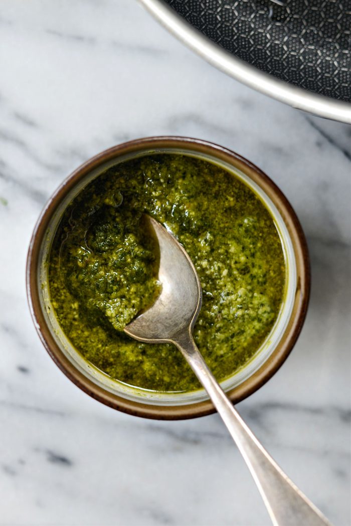 For two eggs, I use 2 tablespoon of pesto. Feel free to use more if you prefer.
