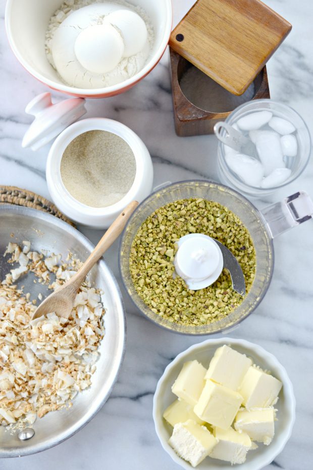 Note: this pistachio toasted coconut pie crust is a little more delicate than traditional pie dough. Please keep in mind that you’ll need to handle it carefully. But once you have it in your pie plate, you can easily mold it and patch any tears easily. And this crust holds up perfectly once baked. Trust me it’s worth it.