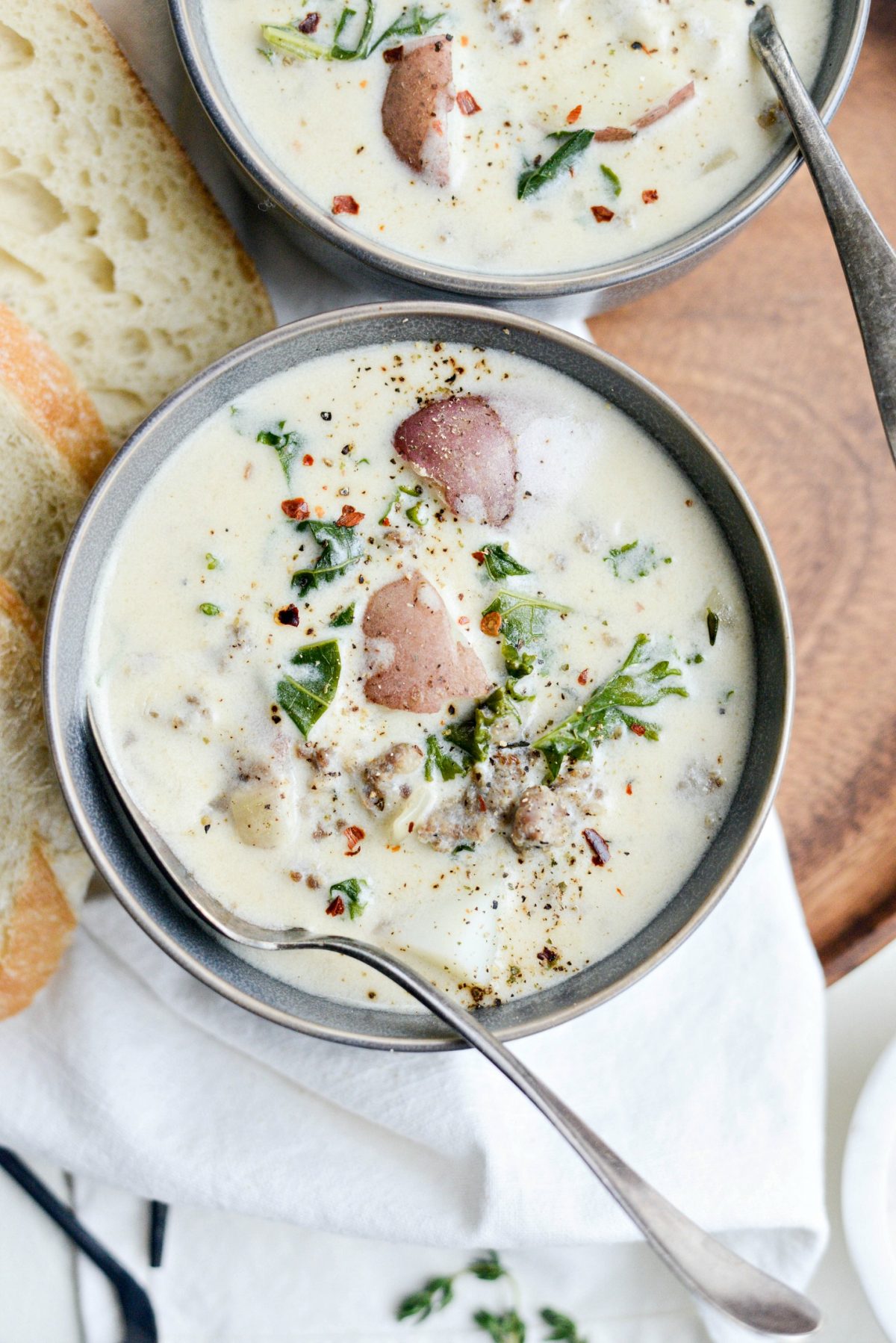 Truth. Not only is this potato, sausage and kale soup one of my favorites but it’s incredibly soul-satisfyingly delicious too! There’s so much textural things happening; creamy, buttery potatoes, chewy and tender sausage and kale. And I feel good about the creamy nature of the soup because there is kale floating among the potatoes and sausage.