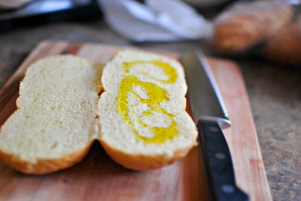 Drizzle the inner side of the top bun with a little olive oil.