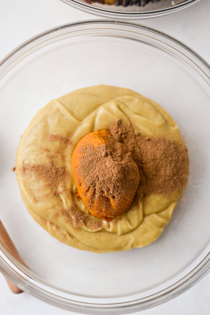 Then to the second bowl, add in the (squeezed) pumpkin puree and 1-1/2 teaspoons pumpkin pie spice.