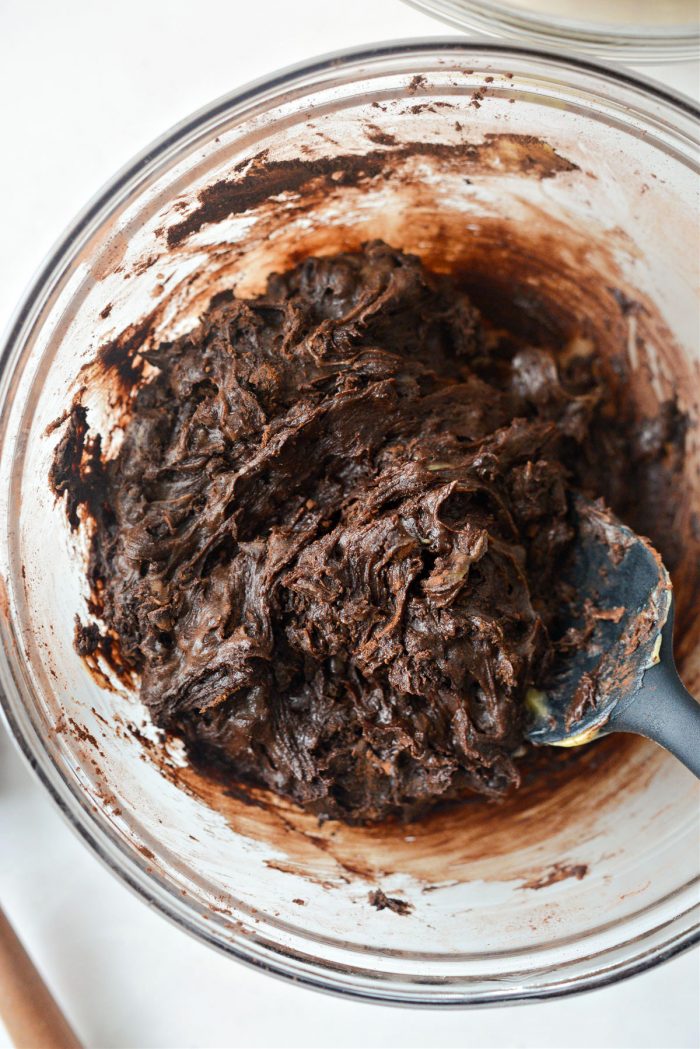 To the first bowl, add 1/3 cup unsweetened dutch processed cocoa powder and 2/3 mini chocolate chips.