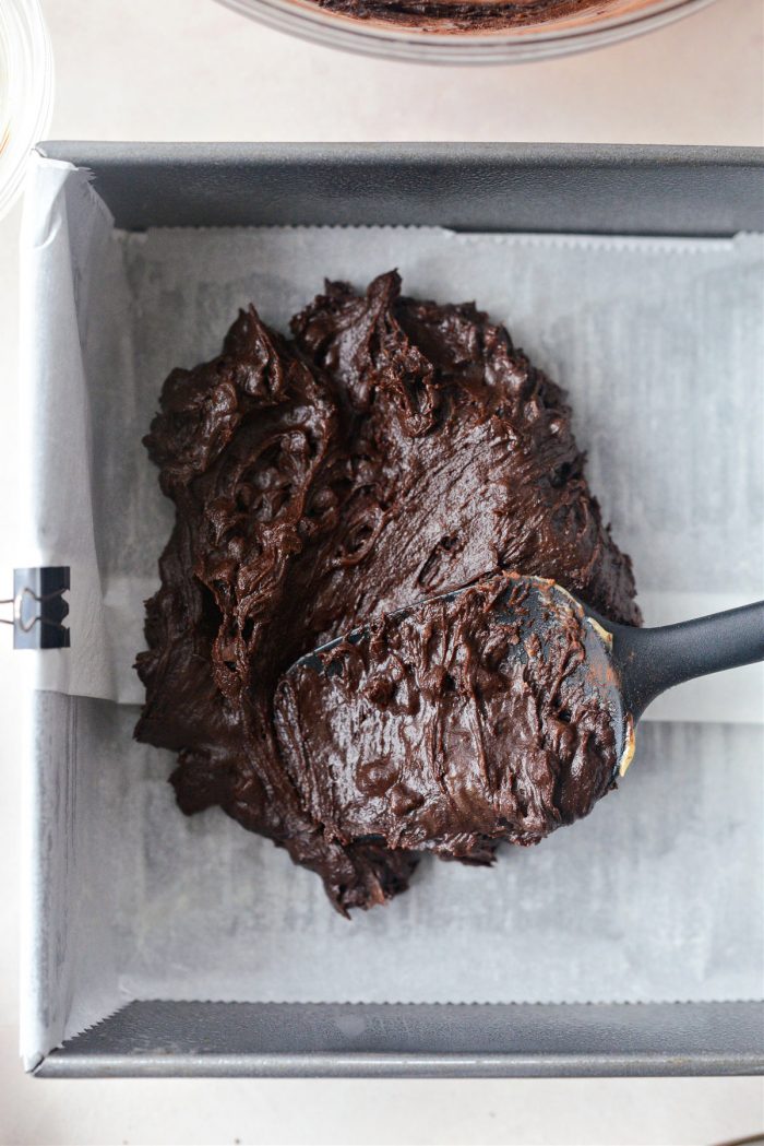 Spray and line an 8×8 square metal baking pan with nonstick baking spray.