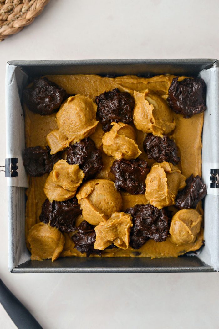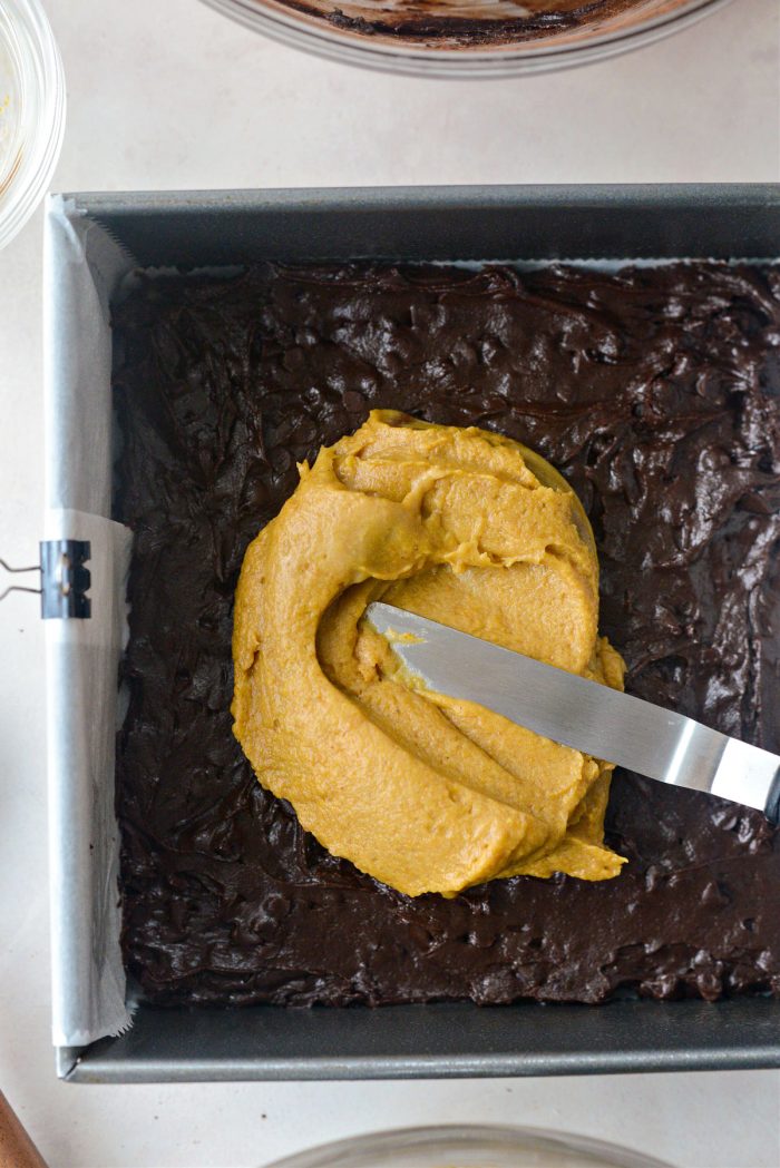 • Spread half of the brownie mixture on the bottom of the pan. Then spread half of the pumpkin mixture on top of that.