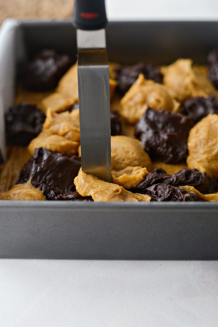- Add spoonfuls of both of the batter on top and drag a knife through the dollops to create a swirl. Tap firmly on the counter to settle the batter before baking on the middle rack of your preheated oven for 20 minutes.
