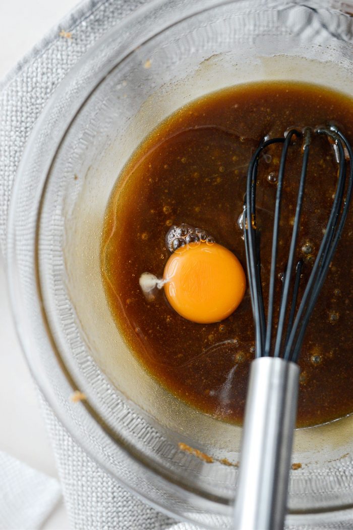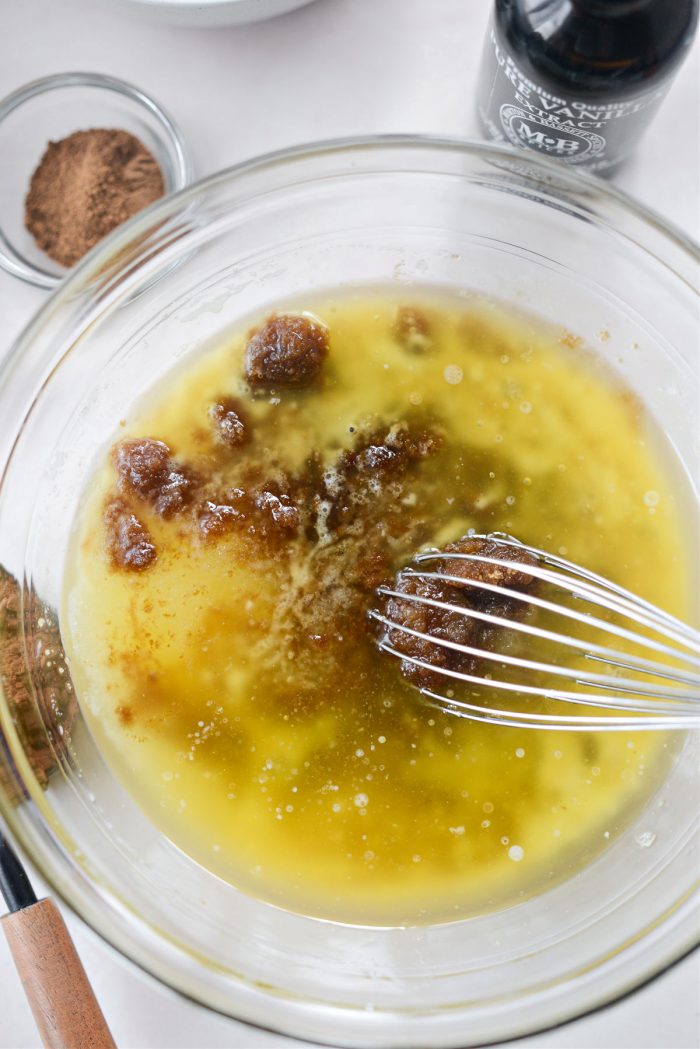 - In a separate bowl, combine melted butter, sugars and vanilla. Whisk to combine.