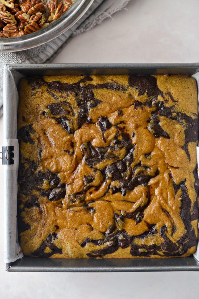 - Once the pumpkin brownies have baked for 25 minutes, pour the pecan pie filling over top and continue baking for 20 more minutes or until set.