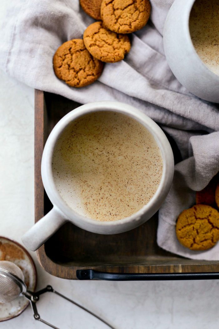 As you know I love chai! The spice and the tea. I’ve steeped the tea into ice cream, and baked the spice blend into pumpkin pie and into apple pecan rolls! Today I’m combining chai latte with pumpkin and pumpkin spice for a milky, cozy beverage collaboration!