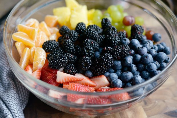- In a large bowl add the prepared strawberries, oranges, pineapple, grapes, blueberries and blackberries.