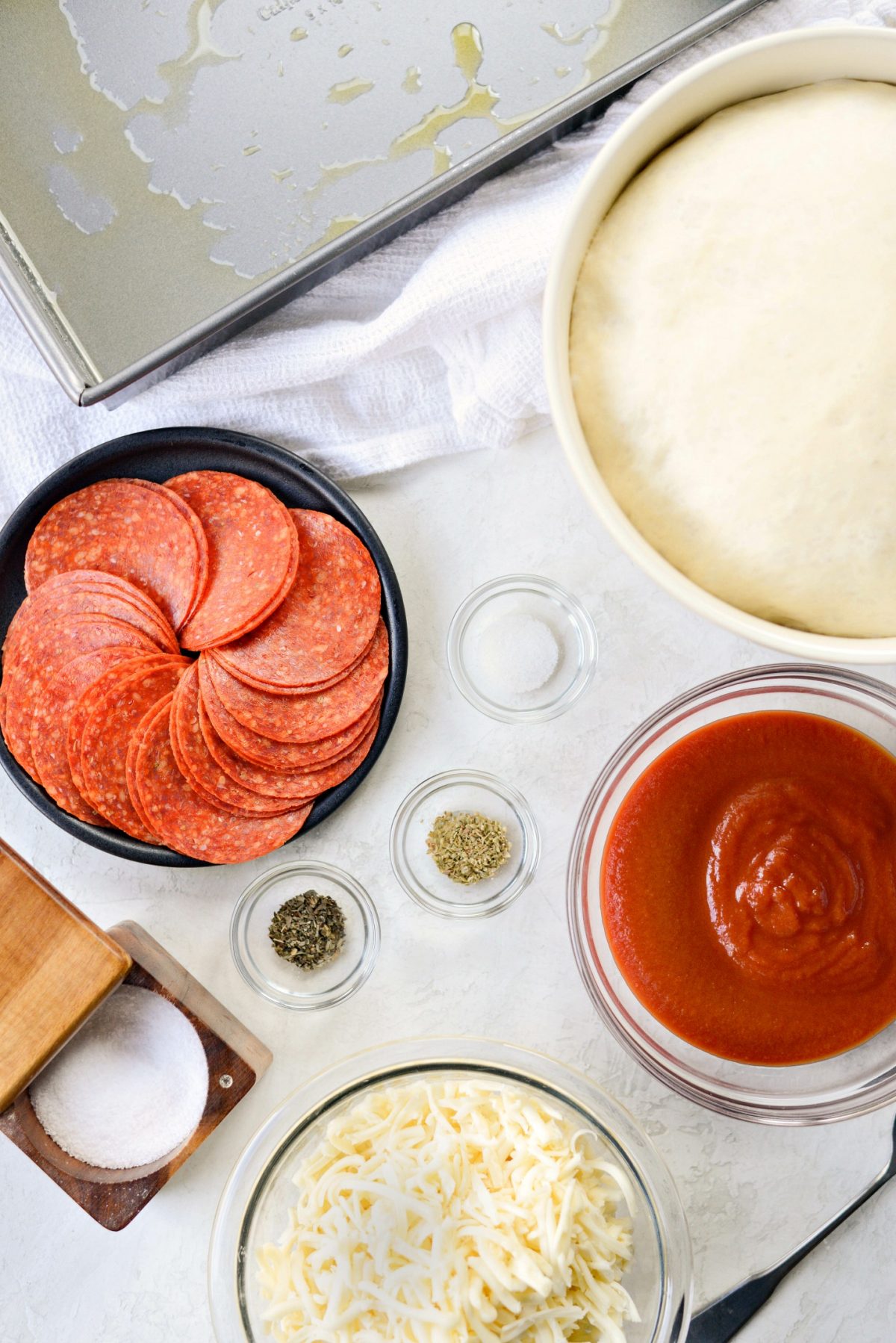 - Set out the pepperoni and grated cheese to be brought up to room temperature and generously grease two 8x8 or 9x9 pans with olive oil.
