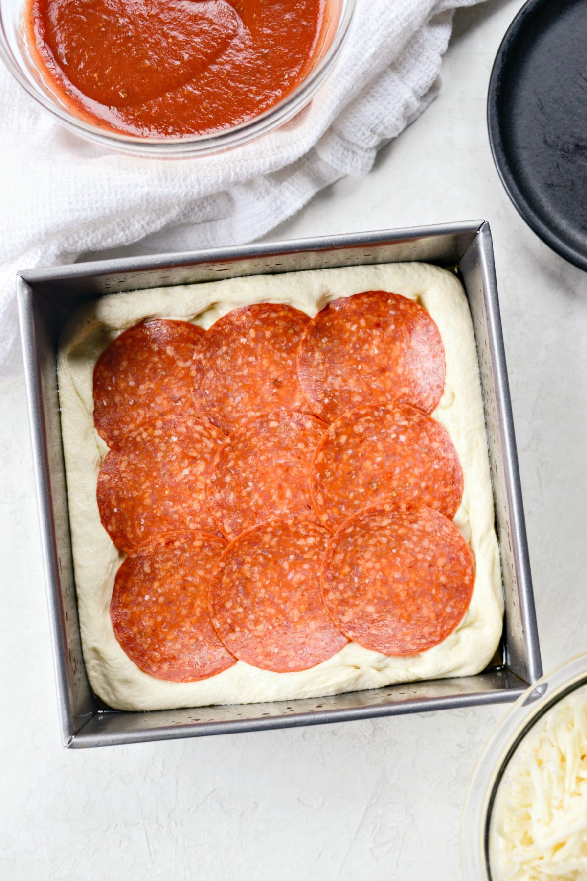 - Once the dough has risen, punch each one down and place each in the prepared baking pans. Stretch the dough to fit each 8x8 pan. Arrange the pepperonis [and it has to be sandwich pepperoni you would get at your deli counter] overlapping and then gently pressing the pepperoni into the pizza dough. Let the dough rise for 20 more minutes before you divide and sprinkle both with the brick cheese. Make sure you get the cheese right up to the edges of the pan.