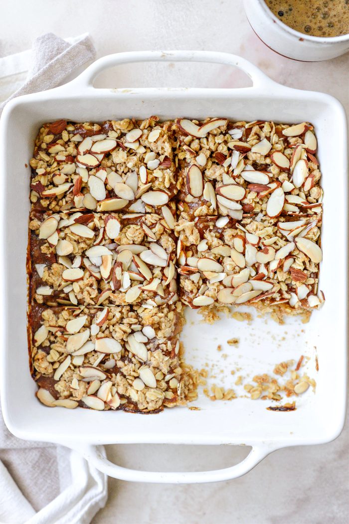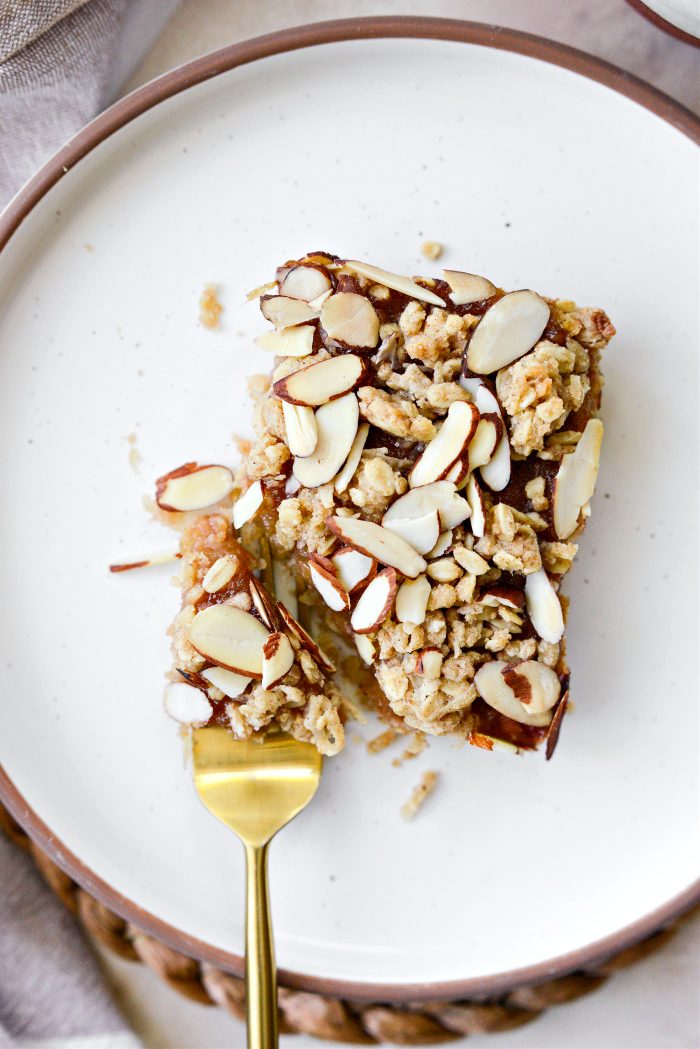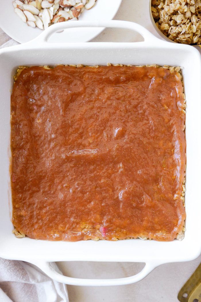 - Once partially baked, spread the rhubarb jam (or jam of your choice) evenly over the top of the oatmeal crust. Then sprinkle with the reserved crumble topping and the sliced almonds before sliding it back into your oven for 15 to 20 more minutes. Or until the crumble topping and oats are lightly golden.