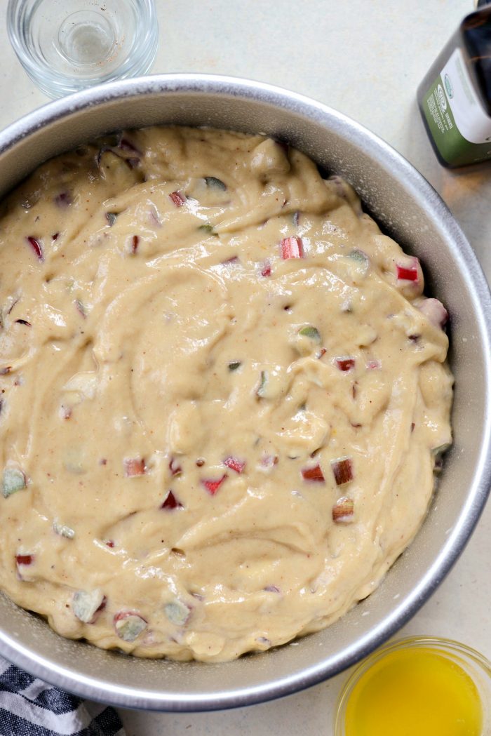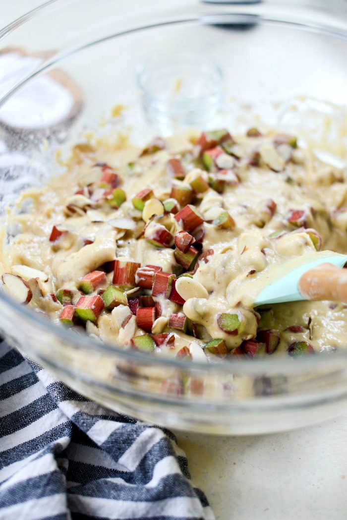 Lastly, add in the rhubarb and almonds. Grab a rubber spatula and fold them into the buttermilk cake batter.