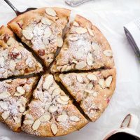 - In a small bowl, combine the sugar, 1/4 cup of almonds and butter. Spoon overtop of the cake and bake on the middle rack of your preheated oven for 30 minutes or until a tester comes out clean with only a few crumbs attached.