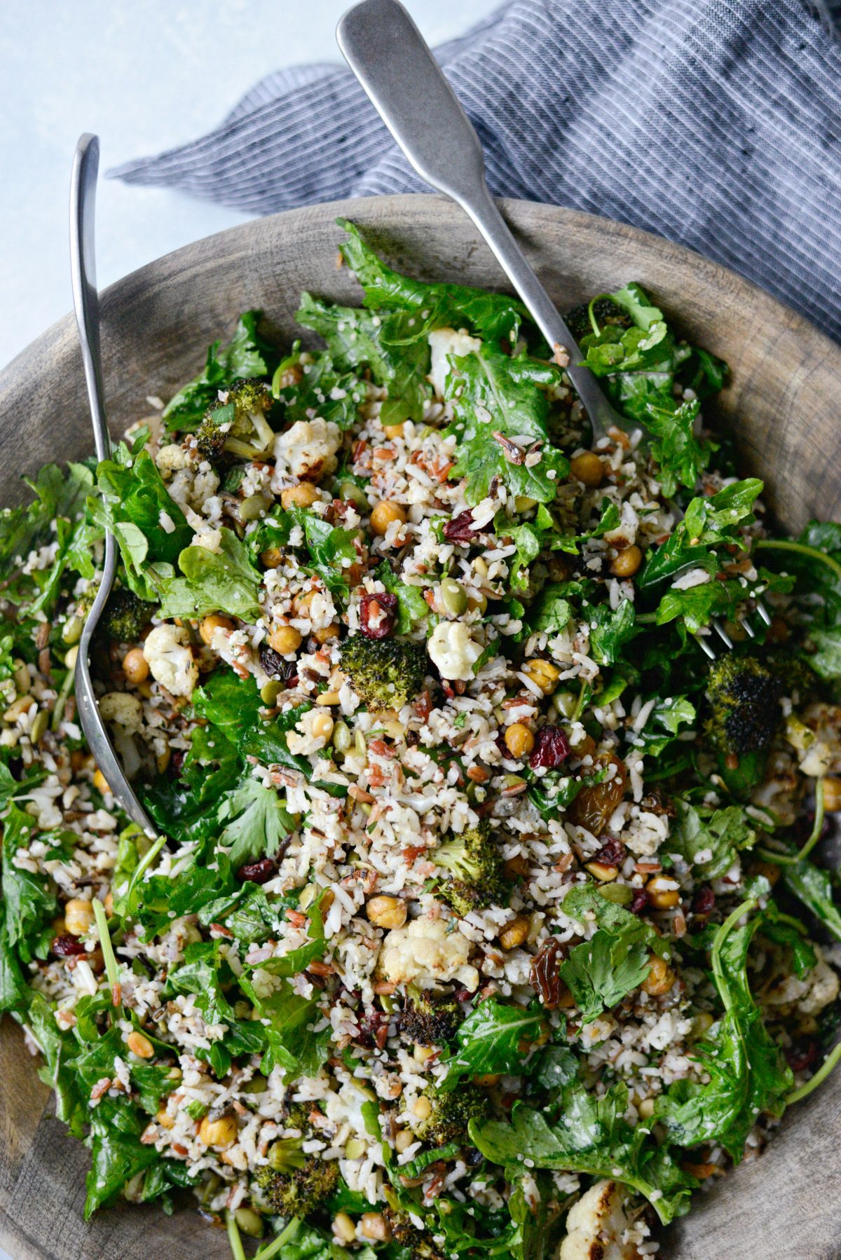Great for dinner, a side salad or meal prep! This Roasted Broccoli Cauliflower Kale Salad is exploding with nutritious goodness and lots of delicious texture! Roasted za’atar broccoli, cauliflower and chickpeas tossed with wild rice, dried cranberries, raisins, pipitas, toasted pine nuts and fresh herbs (to name a few!) with a little fresh lemon juice and olive oil.
