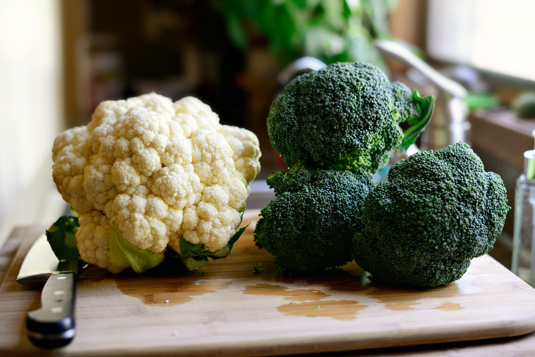 Line two separate rimed baking sheets with parchment and add 12 ounces broccoli florets to one and 8 ounces cauliflower florets to the other. Spray with avocado oil and season with pinches of kosher salt.
