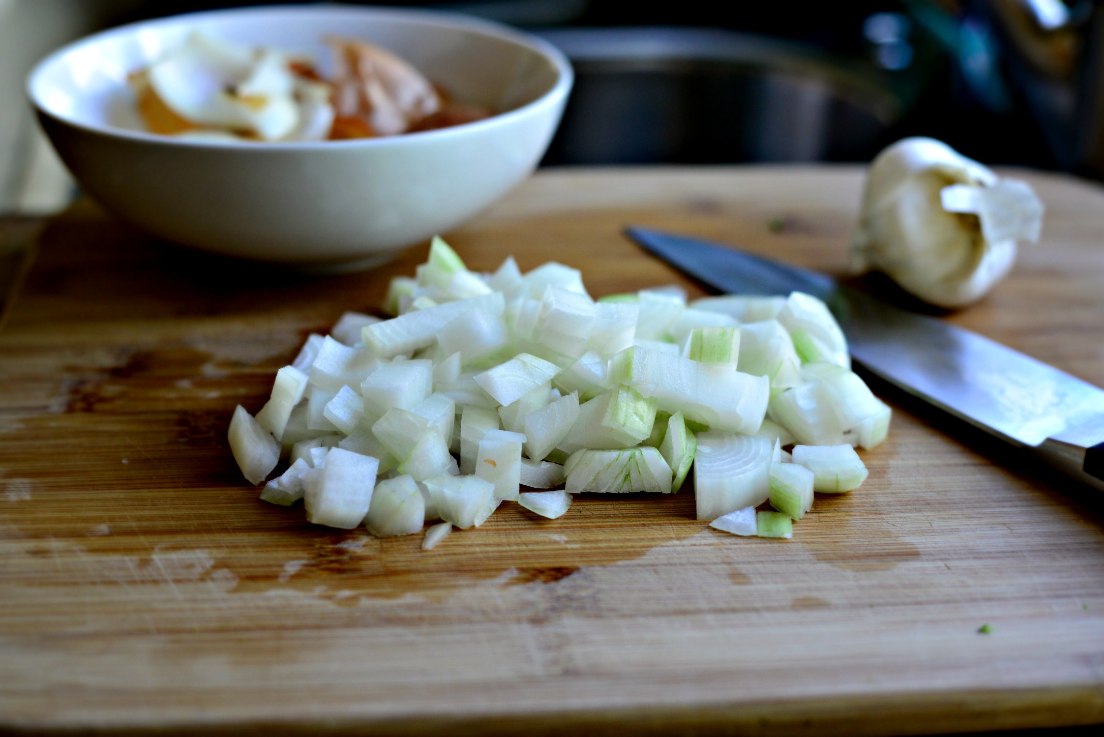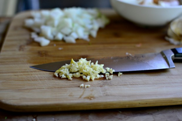 Next remove all but 1 tablespoon of the bacon fat and add in 1 large diced yellow onion and 4 cloves fresh garlic that has been finely minced.