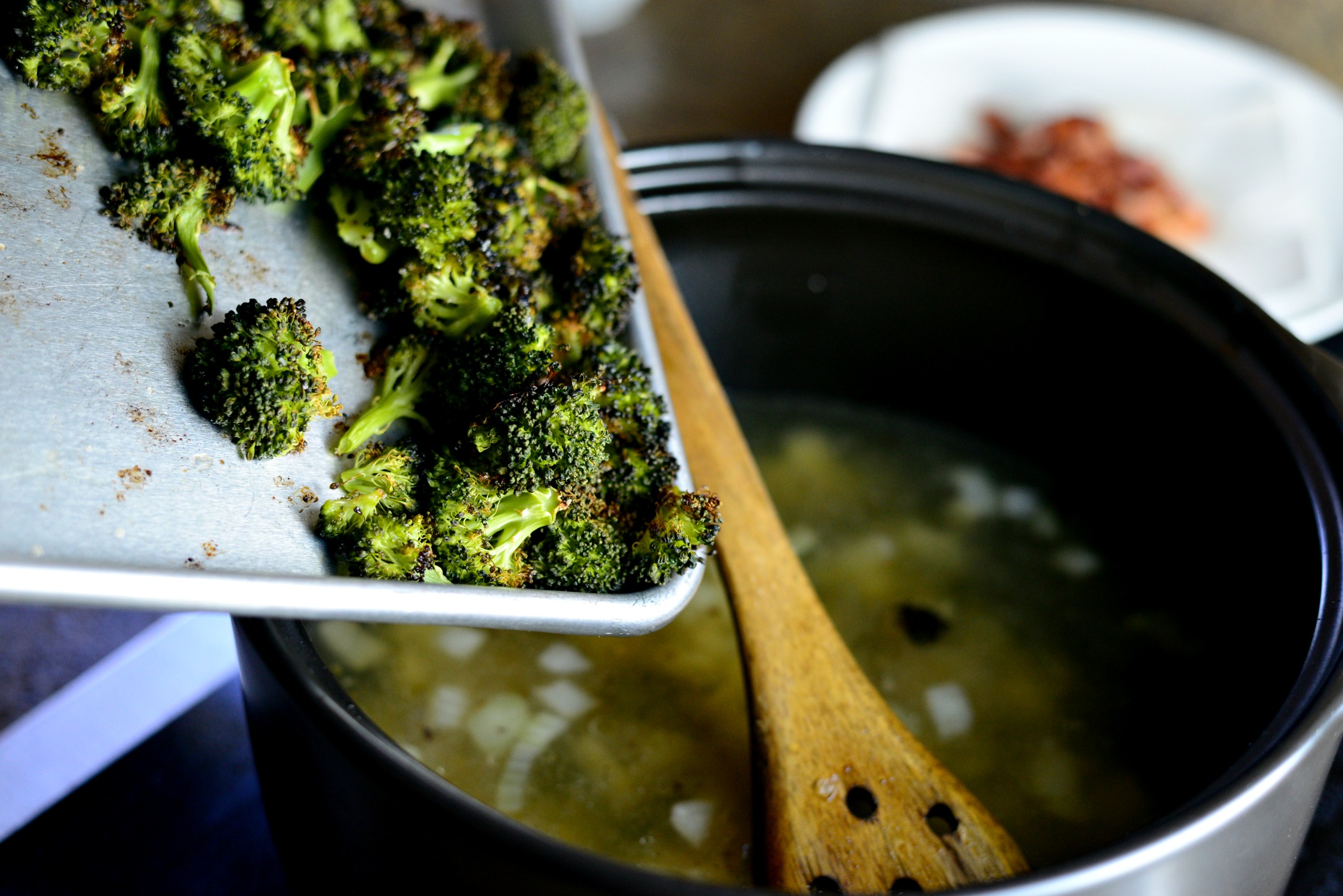 - Next add the roasted broccoli and cauliflower (saving the reserved roasted veggies for later) to the pot and pour in low-sodium chicken broth.Stir, increase heat to medium. Cover and simmer for 15 to 20 minutes.