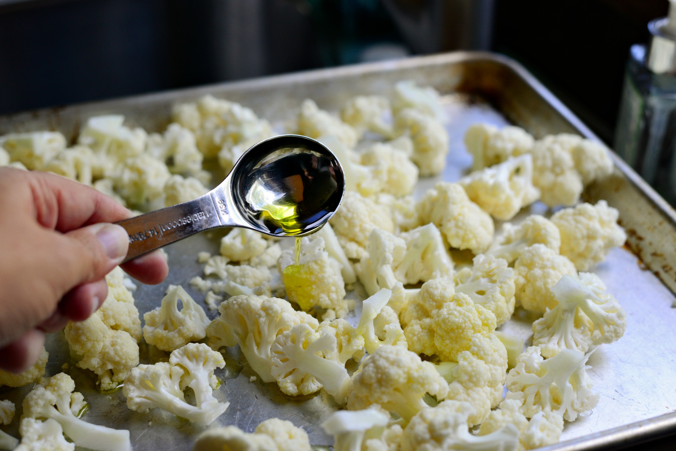 - Line two separate rimed baking sheets with parchment and add the broccoli to one and cauliflower to the other. Spray with avocado oil and season with pinches of kosher salt. Roast in your preheated oven for 20 to 25 minutes, rotating the pans half way through.Reserve 1/4 of each pan of roasted cauliflower and broccoli. We’ll be adding these back in a little later but for now set them off to the side.