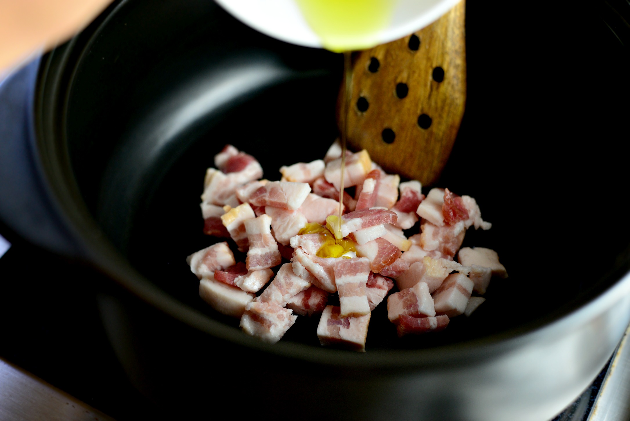 - Next, add the applewood bacon that has been diced to a Dutch oven and heat over medium low. Stir often, cooking until golden and crispy. Use a slotted spoon to remove the bacon and transfer to a paper towel lined plate to drain. Set off to the side.