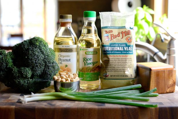 The fewer the ingredients the better amiright? For this you’ll need one large head of broccoli, peanut oil, rice vinegar, nutritional yeast (more on this later in the post), salt, lightly salted peanuts (chopped) and green onions.