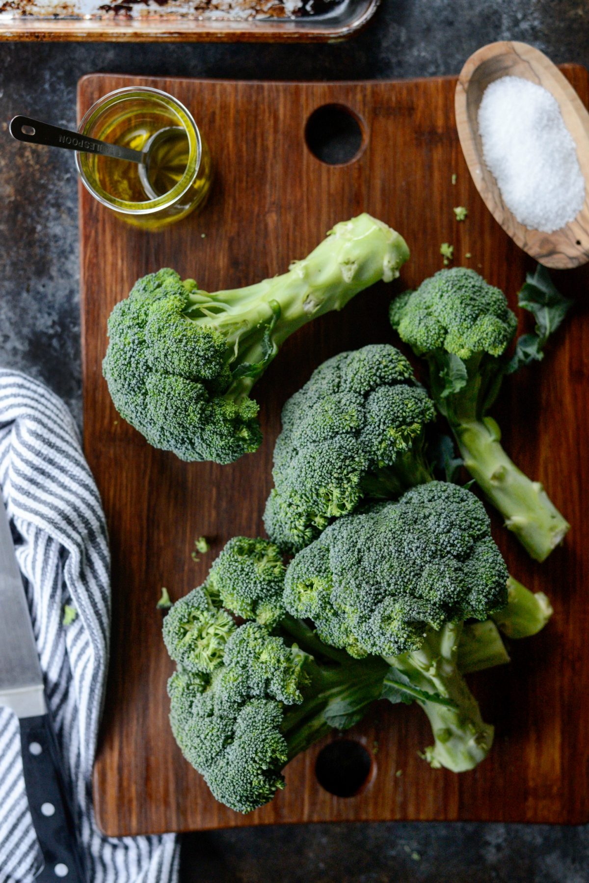 Trim of all the stems and cut the broccoli into small florets. Cut the larger florets in half and leave the smaller ones alone. Then throw all that broccoli onto your metal, rimmed baking sheet.