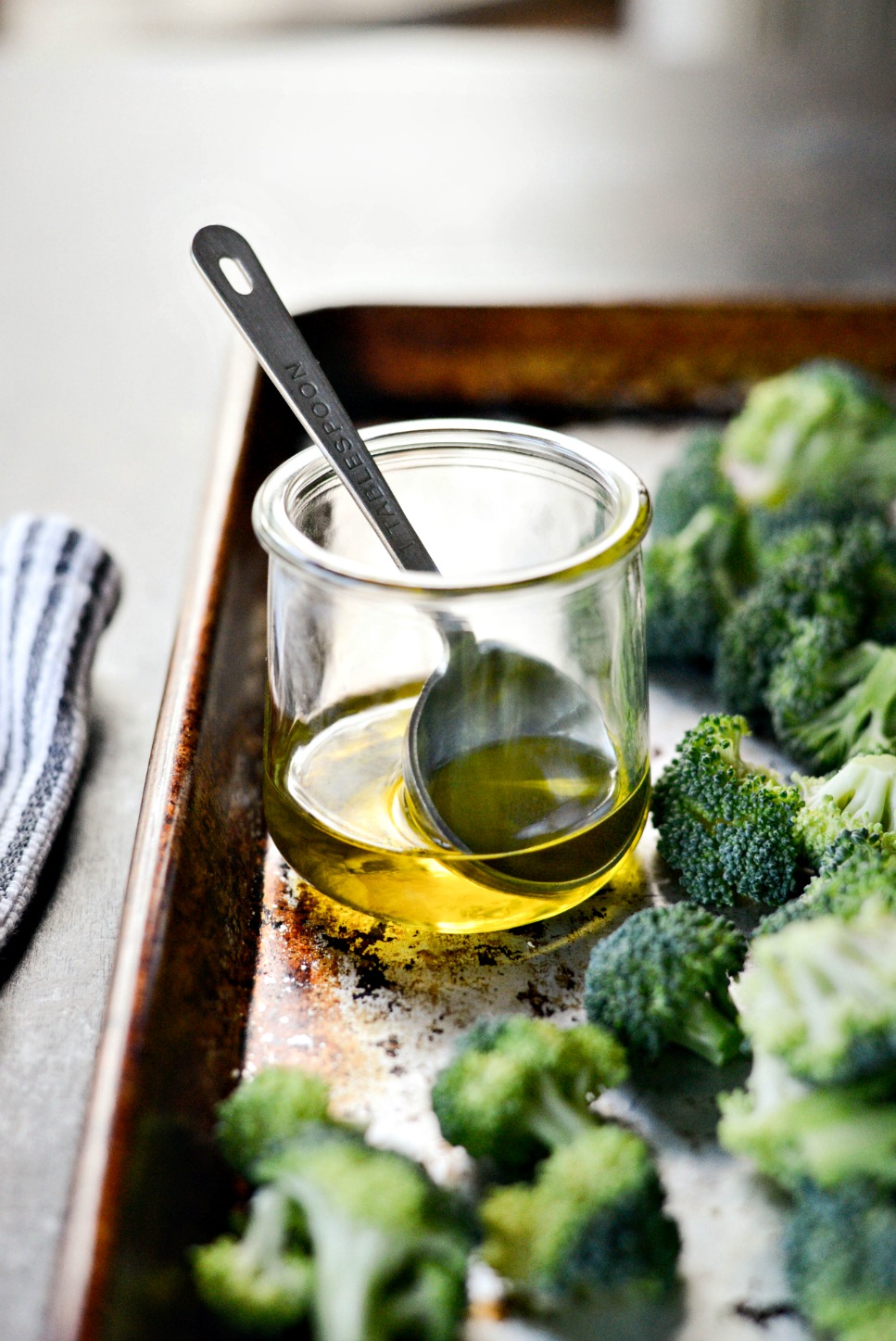 - Cut broccoli in to bite-size florets and place on a metal, rimmed sheet pan. Drizzle with oil and toss with your hands.